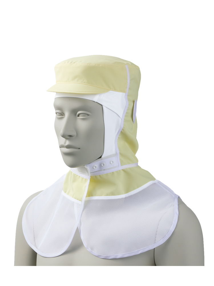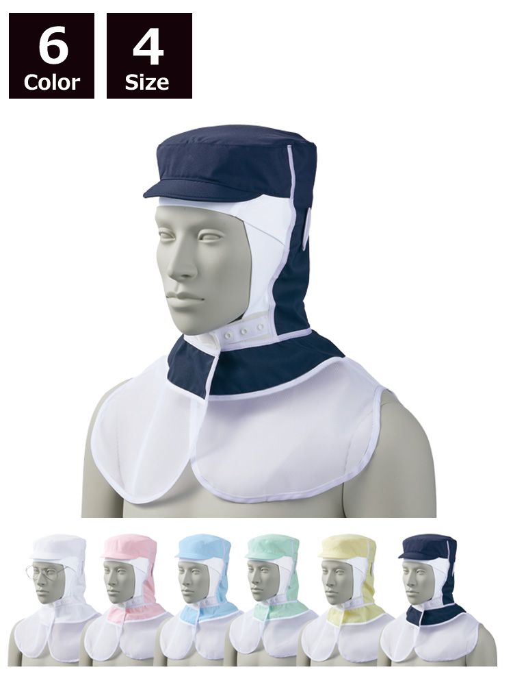 顔まわりをすっぽり覆い、異物混入をしっかりと防ぐ頭巾タイプの衛生帽子。