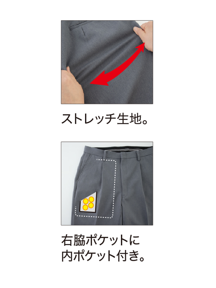 帯電防止加工を施しているため、さまざまな職種に対応。ドレスシャツやネクタイと合わせれば、スーツスタイルにも好相性です。右脇ポケットに内ポケット付き。