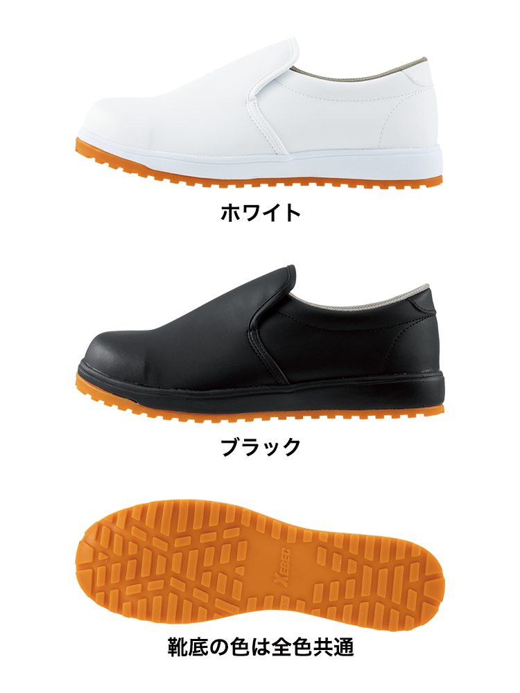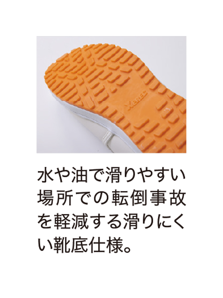 厨房で求められる滑りにくさを追求し、クッション性にも優れた耐滑ソールを採用しました。水はもちろん、油分の多い厨房でも足元をしっかりサポートする先芯入りの耐滑厨房シューズです。