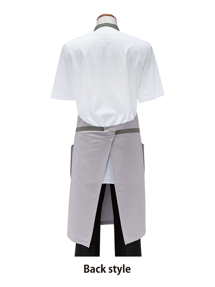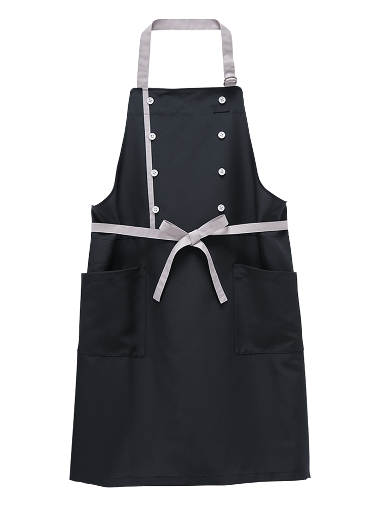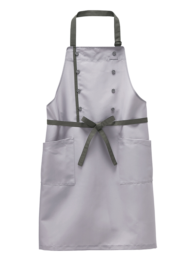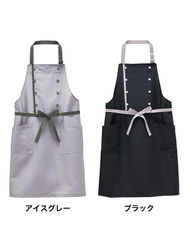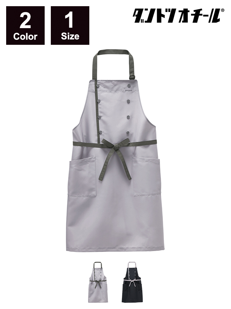 汚れに強く、コックコート風のデザインが目を引く胸当てエプロンです。