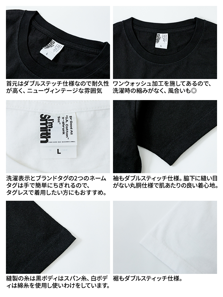 黒ボディは耐久性に優れたスパン糸、白ボディは染まりの良い綿糸を使い分けるなど、細部までこだわっています。