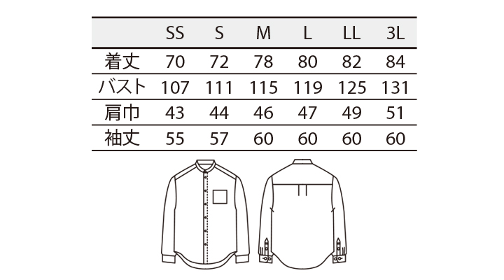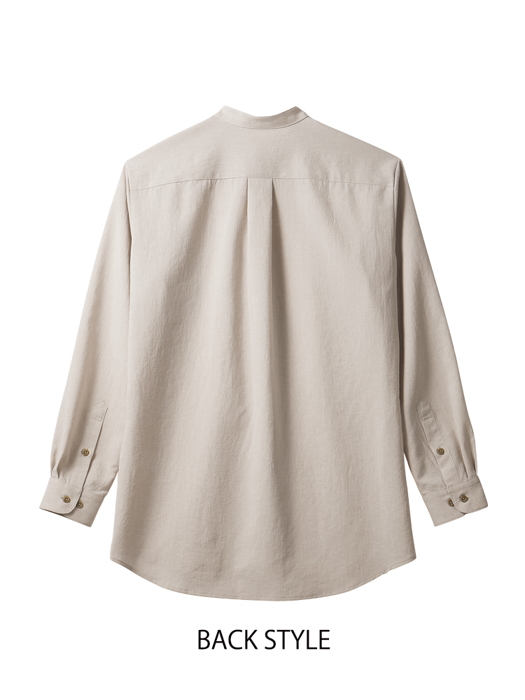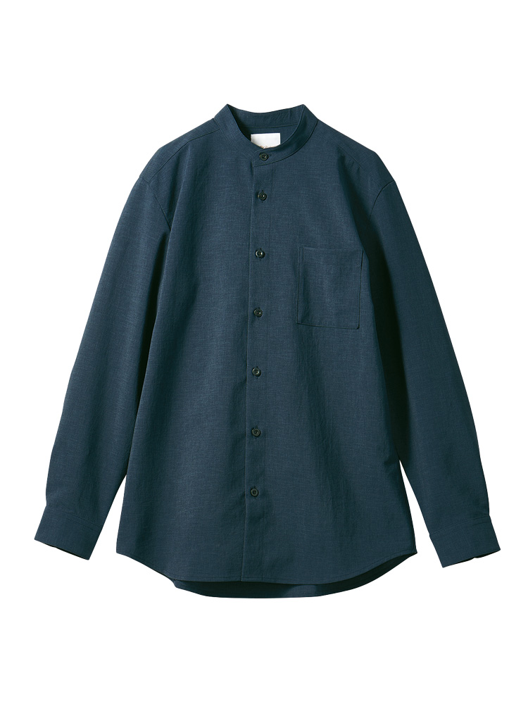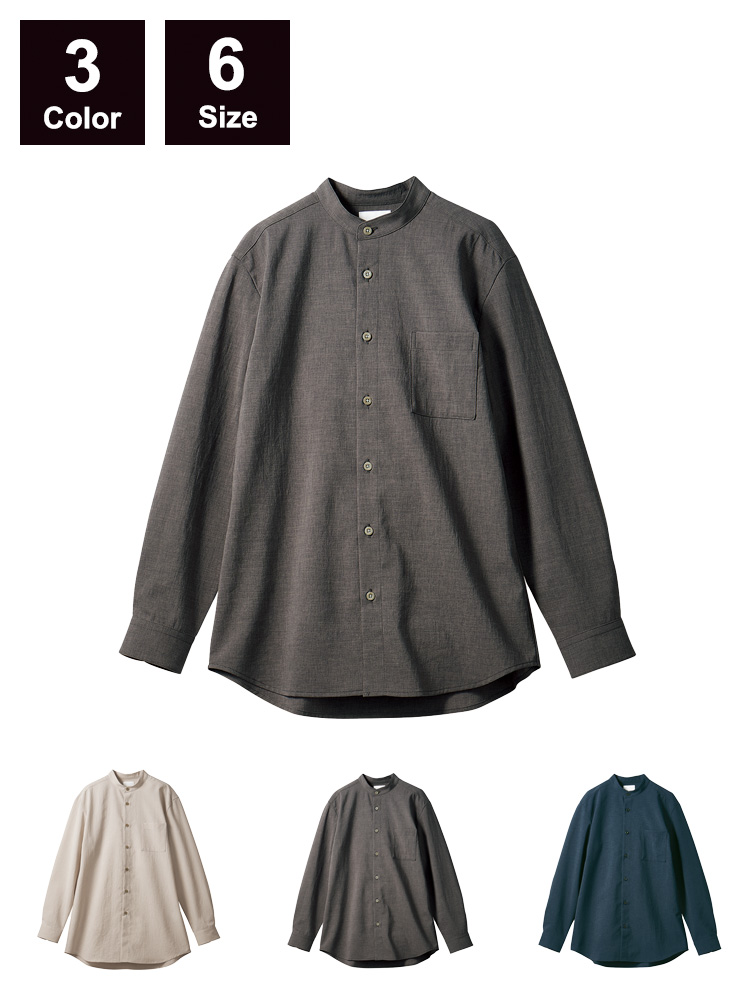 バンドカラーで首元すっきり、リラックスしたシルエットの長袖シャツ。