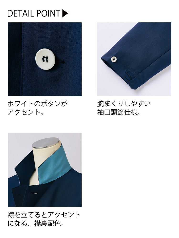 ホワイトのボタンや衿裏の配色など細かいデティールにこだわった、シンプルながらも差がつくデザインに仕上げました。