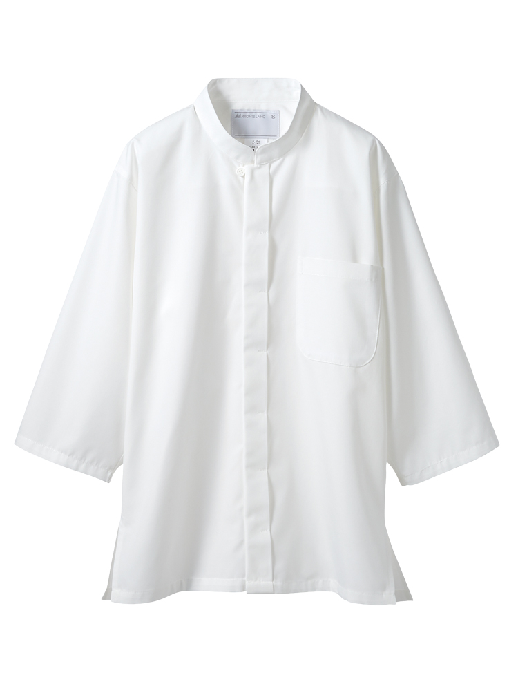 スタンドカラーの7分袖の調理シャツ。