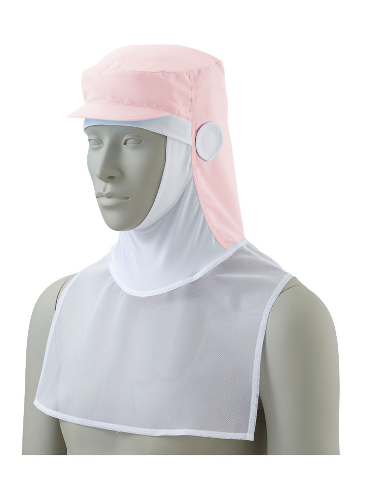 顔まわりをすっぽり覆い、異物混入をしっかりと防ぐ頭巾タイプの衛生帽子。