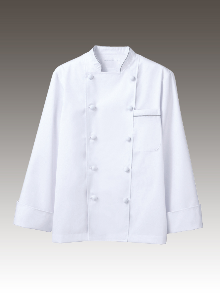 襟と胸元にあしらったパイピングが、シンプルなコックコートのアクセントに。